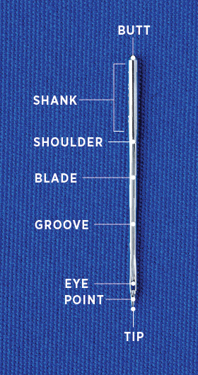 against the needle stop when properly installed. - The Shank: Varies in size, length, and shape depending on the machine. Most domestic sewing needles have a flat side, while industrial or commercial needles are usually round. The shank secures the needle in the needle bar.