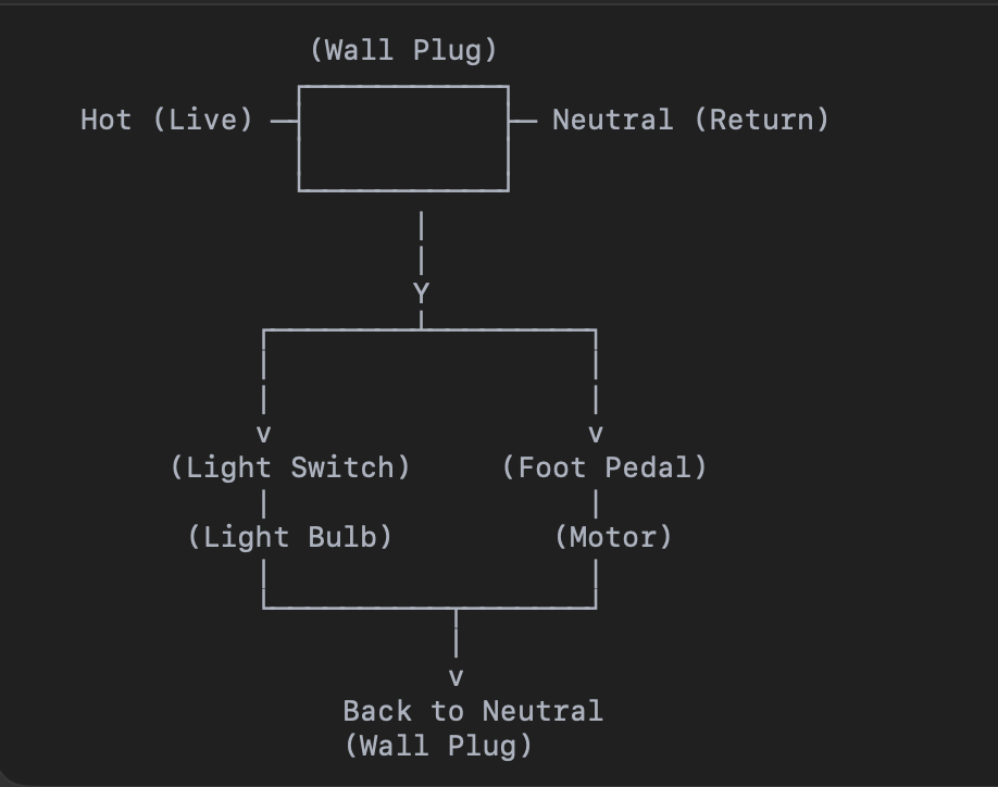 ????????????????????????In a sewing machine there are two circuits combined into one. The hot wire comes from the plug, Y's off into two circuits, one side goes to the light switch then the light then the neutral goes to negative side of the plug, the other side of the hot goes to the foot pedal, to the motor and then the negative ties into the negative coming from the light.
