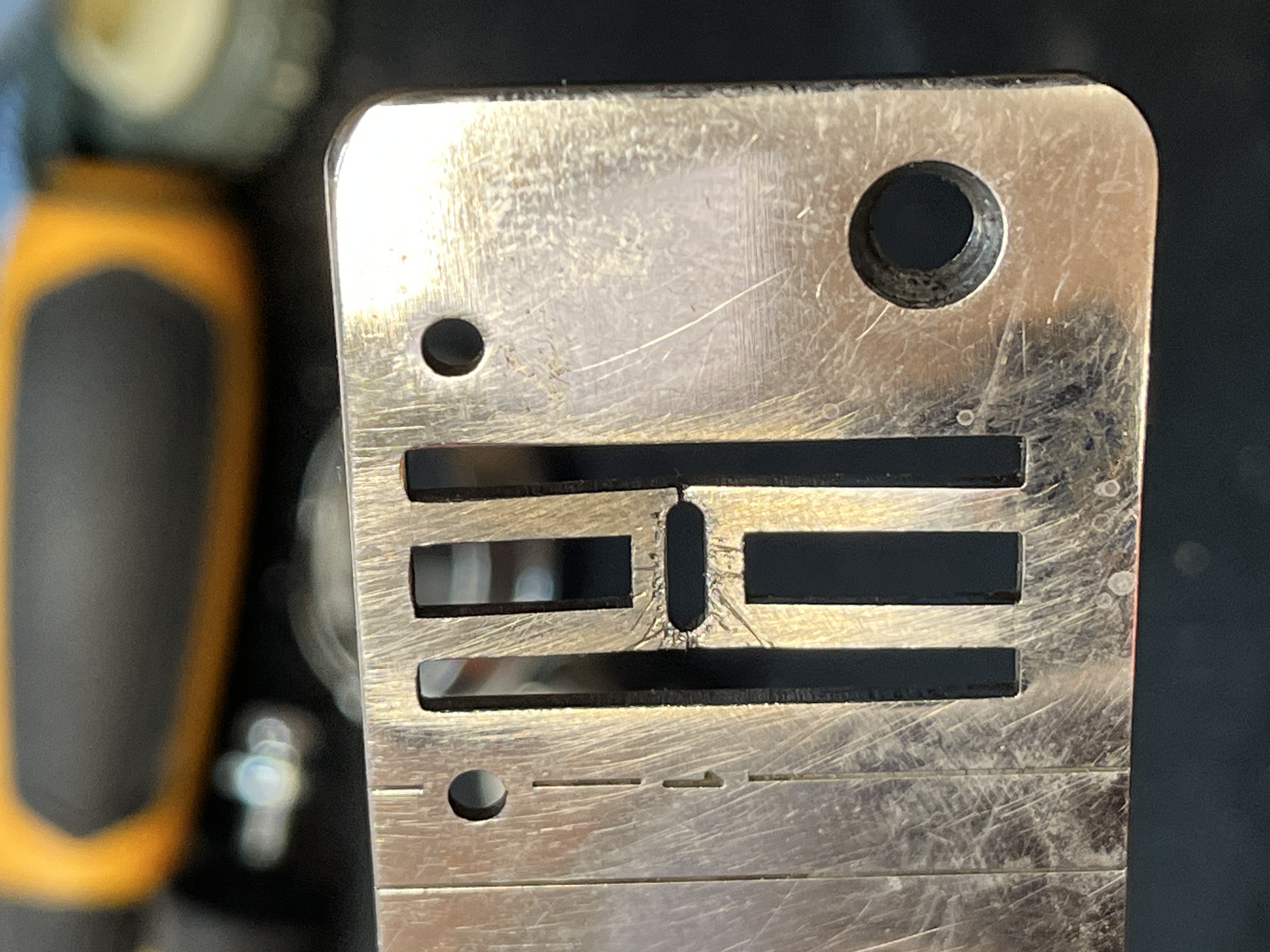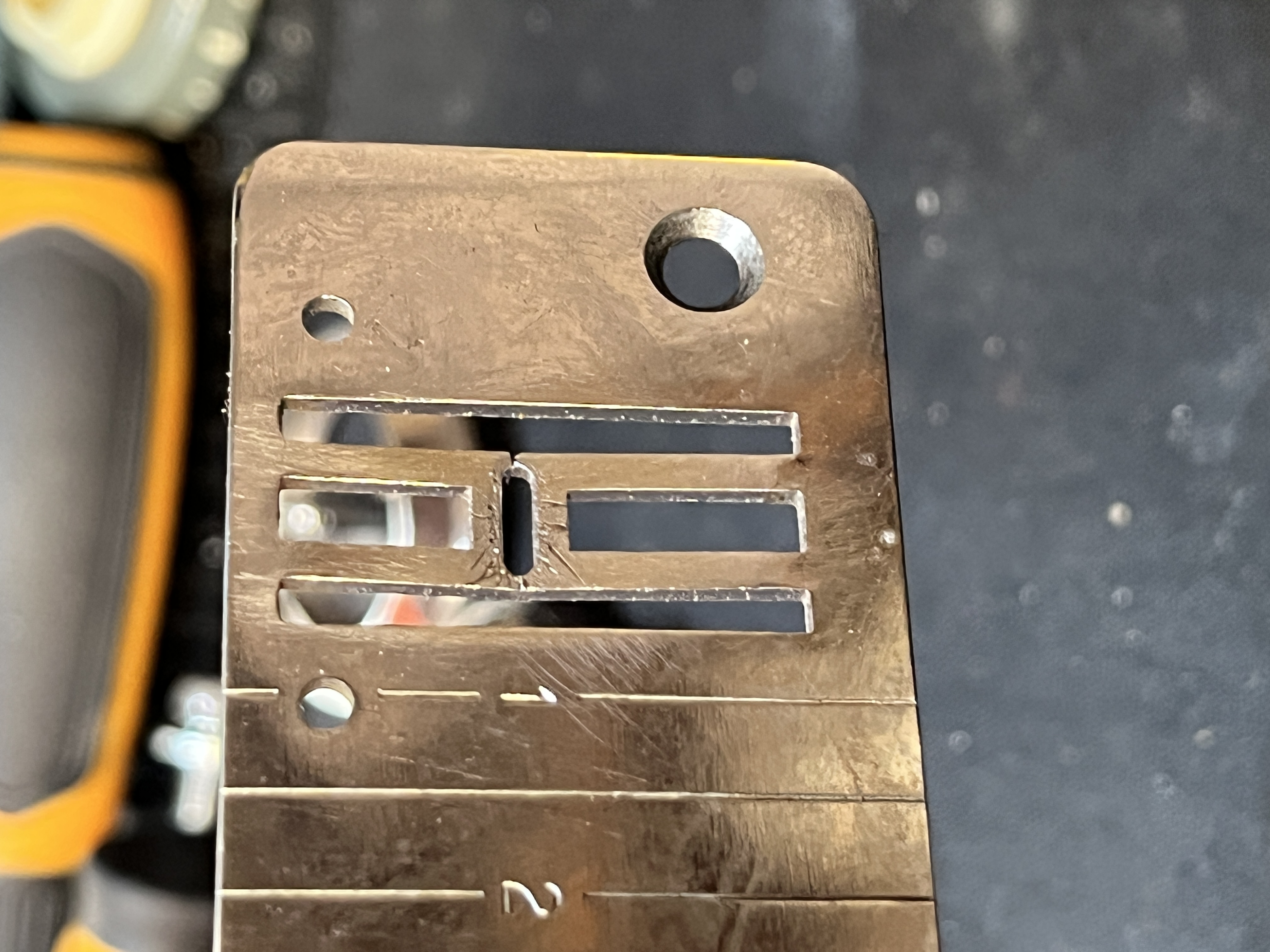 Here is an example of a needle plate that has been hit by the needle.